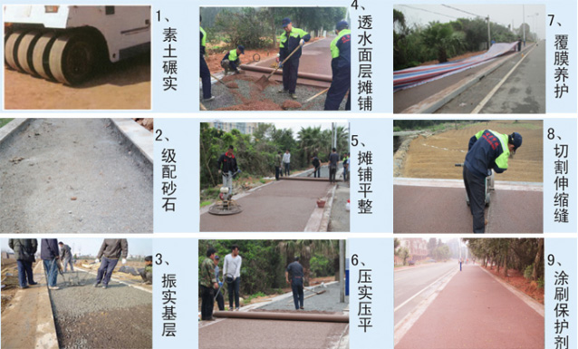 成品:透水地坪的澆水養(yǎng)護時間不少于7天。最后噴涂一層表面潤色封閉劑,使其在各方面達到趨于理想的效果。